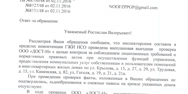 Номер жалобы:10517 Тип жалобы:Иные проблемы ЖКХ Название объекта:Управляющая Компания Город:Новосибирск Адрес:Новосибирск, улица Крылова, 27 Описание жалобы:больше сосульки Статус:
