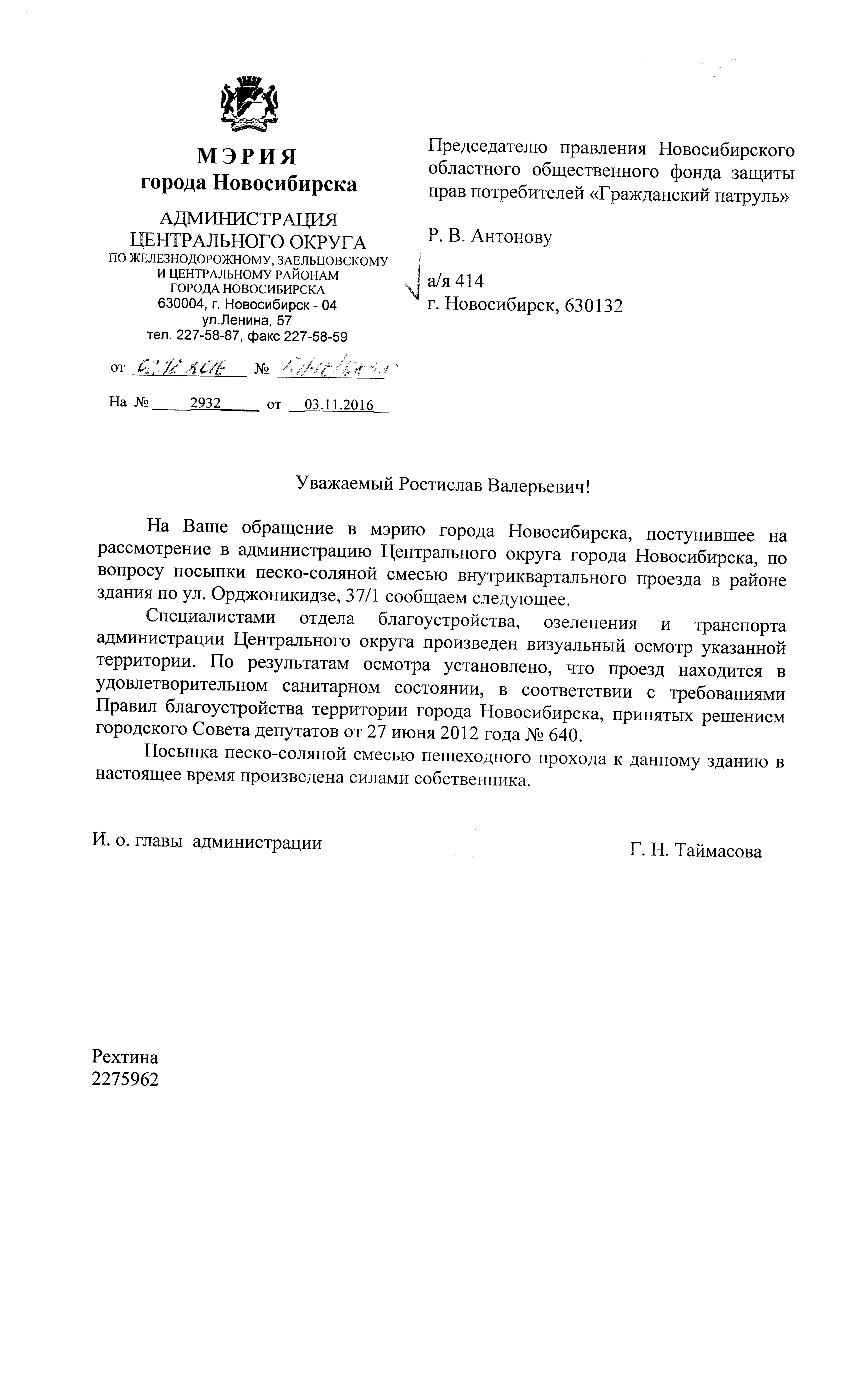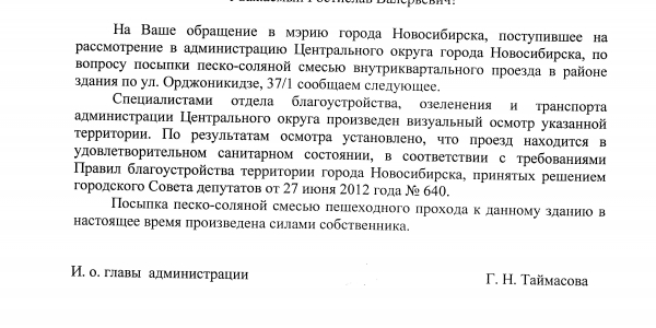 Номер жалобы:10478 Тип жалобы:Иные проблемы ЖКХ Название объекта:Управляющая Компания Город:Новосибирск Адрес:Новосибирск, улица Орджоникидзе, 37/1 Описание жалобы:Скользкая дорога Статус: