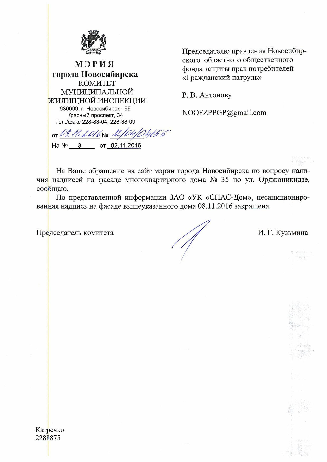 Номер жалобы:10480 Тип жалобы:Иные проблемы ЖКХ Название объекта:Управляющая Компания Город:Новосибирск Адрес:Новосибирск, улица Орджоникидзе, 37/1 Описание жалобы:Надписи на хоз корпусе Статус: