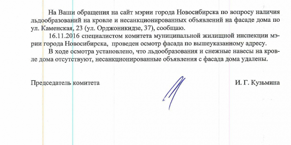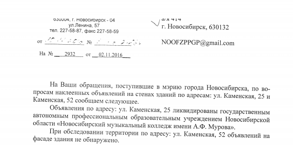 Номер жалобы:10476 Тип жалобы:Иные проблемы ЖКХ Название объекта: Регион:Новосибирская область Город:Новосибирск Адрес:улица Каменская, 25 Описание жалобы:Объявления на фасаде Статус: