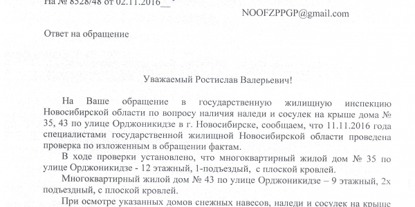 Номер жалобы:10481 Тип жалобы:Иные проблемы ЖКХ Название объекта: Регион:Новосибирская область Город:Новосибирск Адрес:улица Орджоникидзе, 35 Описание жалобы:сосульки на крыше Статус: