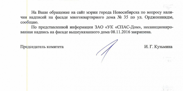 Номер жалобы:10483 Тип жалобы:Иные проблемы ЖКХ Название объекта:Управляющая Компания Город:Новосибирск Адрес:Новосибирск, улица Орджоникидзе, 35 Описание жалобы:Надписи на стенах дома Статус: