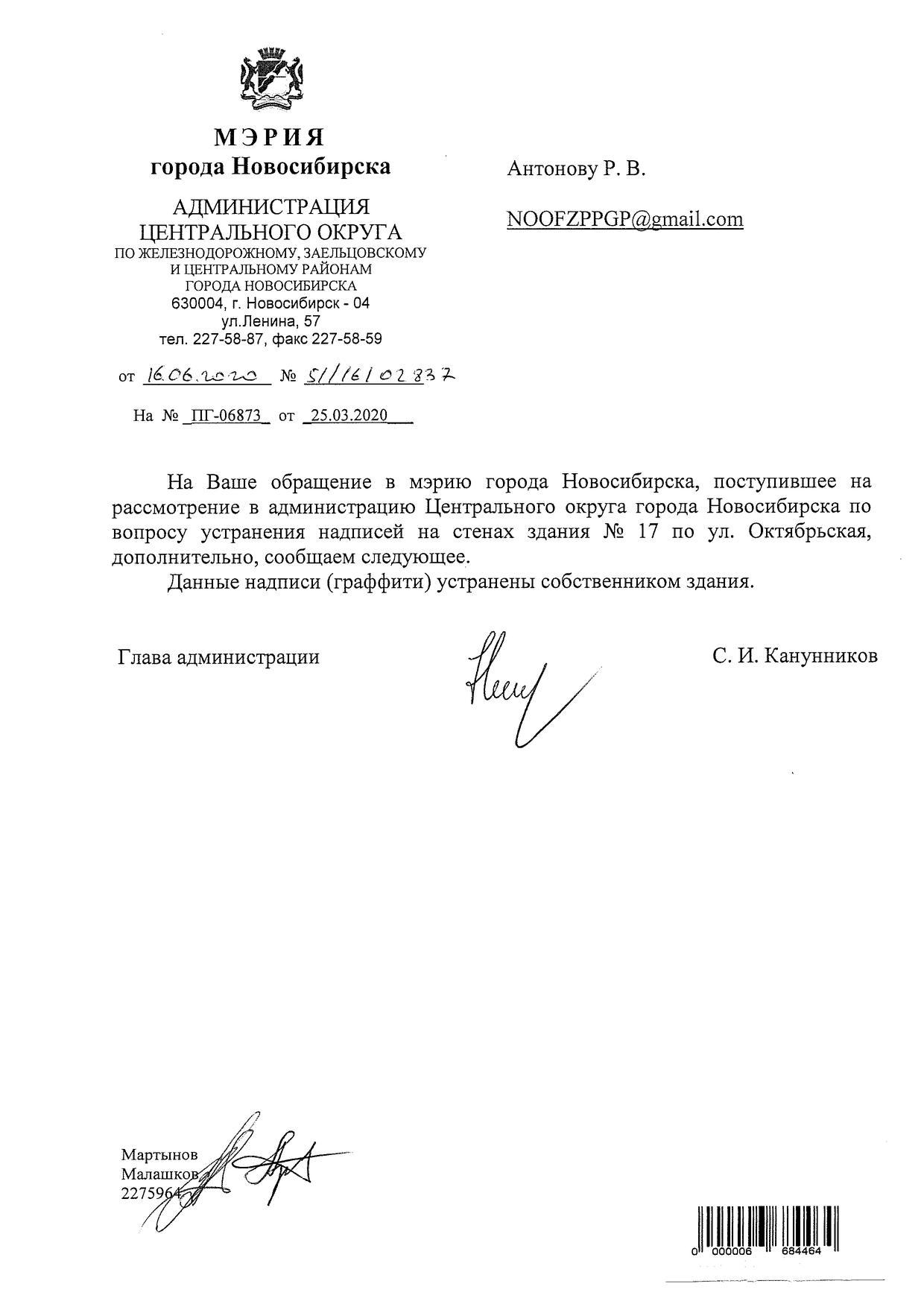 Номер жалобы:64763 Тип жалобы:Прочее Название объекта: Регион:Новосибирская область Город:Новосибирск Адрес:Октябрьская улица, 17 Описание жалобы:Со стороны улицы советская надписи и граффити Статус: