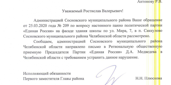 Номер жалобы:64795 Тип жалобы:Прочее Название объекта: Регион:Челябинская область Город:посёлок Саккулово Адрес:улица Мира, 7 Описание жалобы:На фасаде здания школы в селе Саккулово Сосновского района Челябинской области развешено настенное панно с рекламой политической партии Единая Россия. Оно уродует фасад и является незаконной рекламой на фасаде здания. Требую демонтаж. Статус: