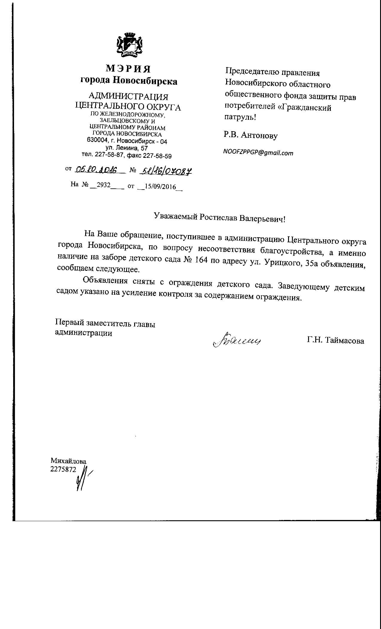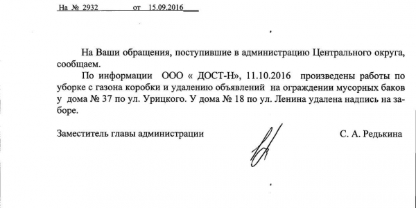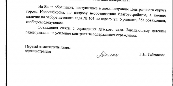 Номер жалобы:9106 Тип жалобы:Иные проблемы ЖКХ Название объекта:Управляющая Компания Город:Новосибирск Адрес:Новосибирск, улица Урицкого, 35А Описание жалобы:Объявления на заборе Статус: