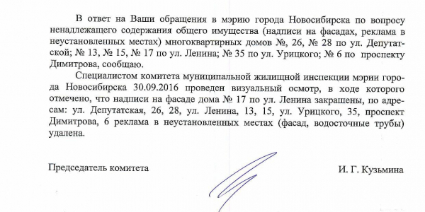 Номер жалобы:9083 Тип жалобы:Иные проблемы ЖКХ Название объекта:Управляющая Компания Город:Новосибирск Адрес:Новосибирск, улица Ленина, 18 Описание жалобы:Объявления на водостоке Статус:
