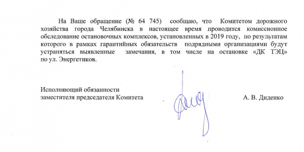 Номер жалобы:64745 Тип жалобы:Прочее Название объекта: Регион:Челябинская область Город:Челябинск Адрес:улица Энергетиков Описание жалобы:Остановка ДК ТЭЦ. Выбили и выдавили стекла на остановка в ту и другую сторону.. Статус: