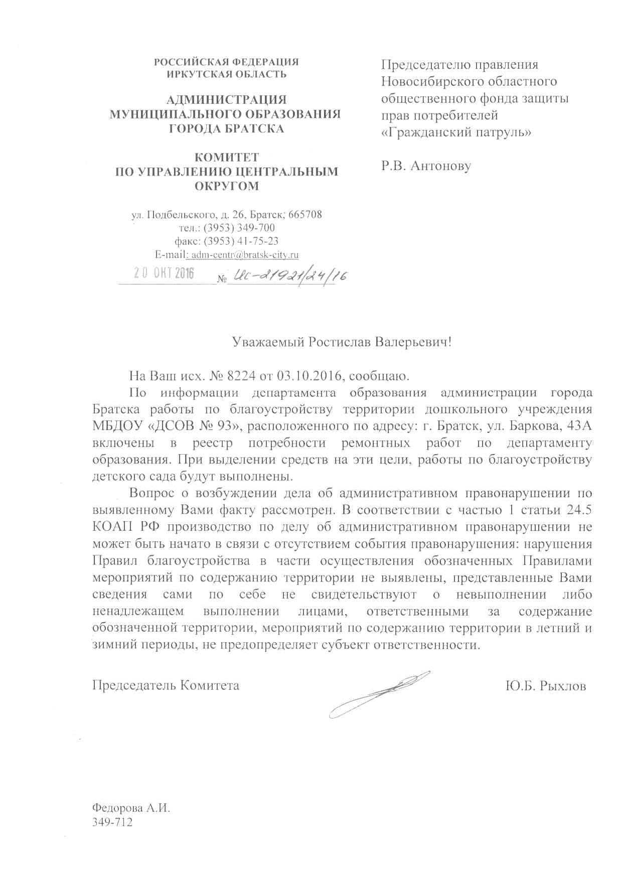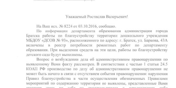 Номер жалобы:8224 Тип жалобы:Иные проблемы ЖКХ Название объекта:Администрвция Города Регион:Иркутская область Город:Братск Адрес:ул. Баркова, 43а Описание жалобы:Нет отсыпки на детской площадке Статус: