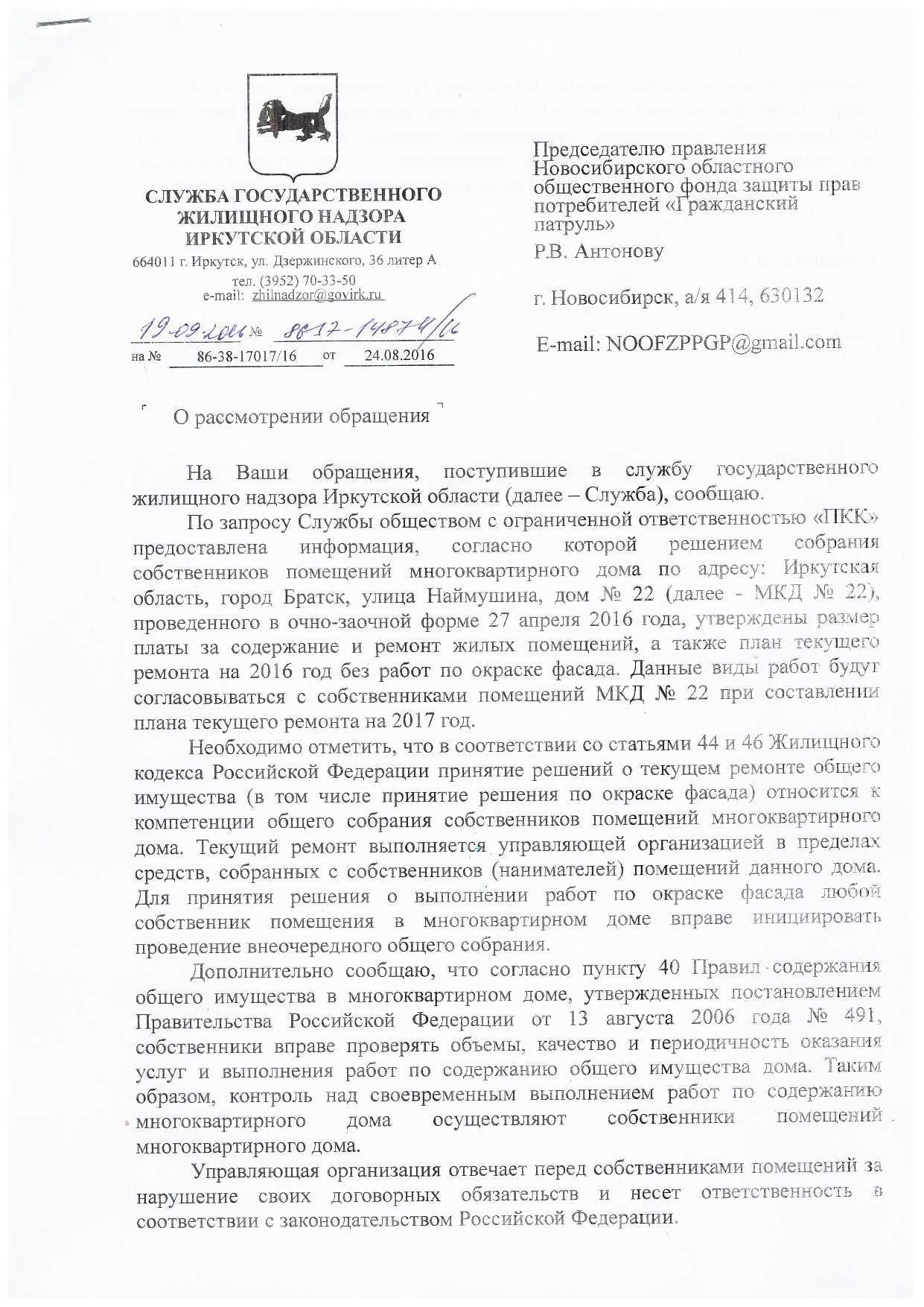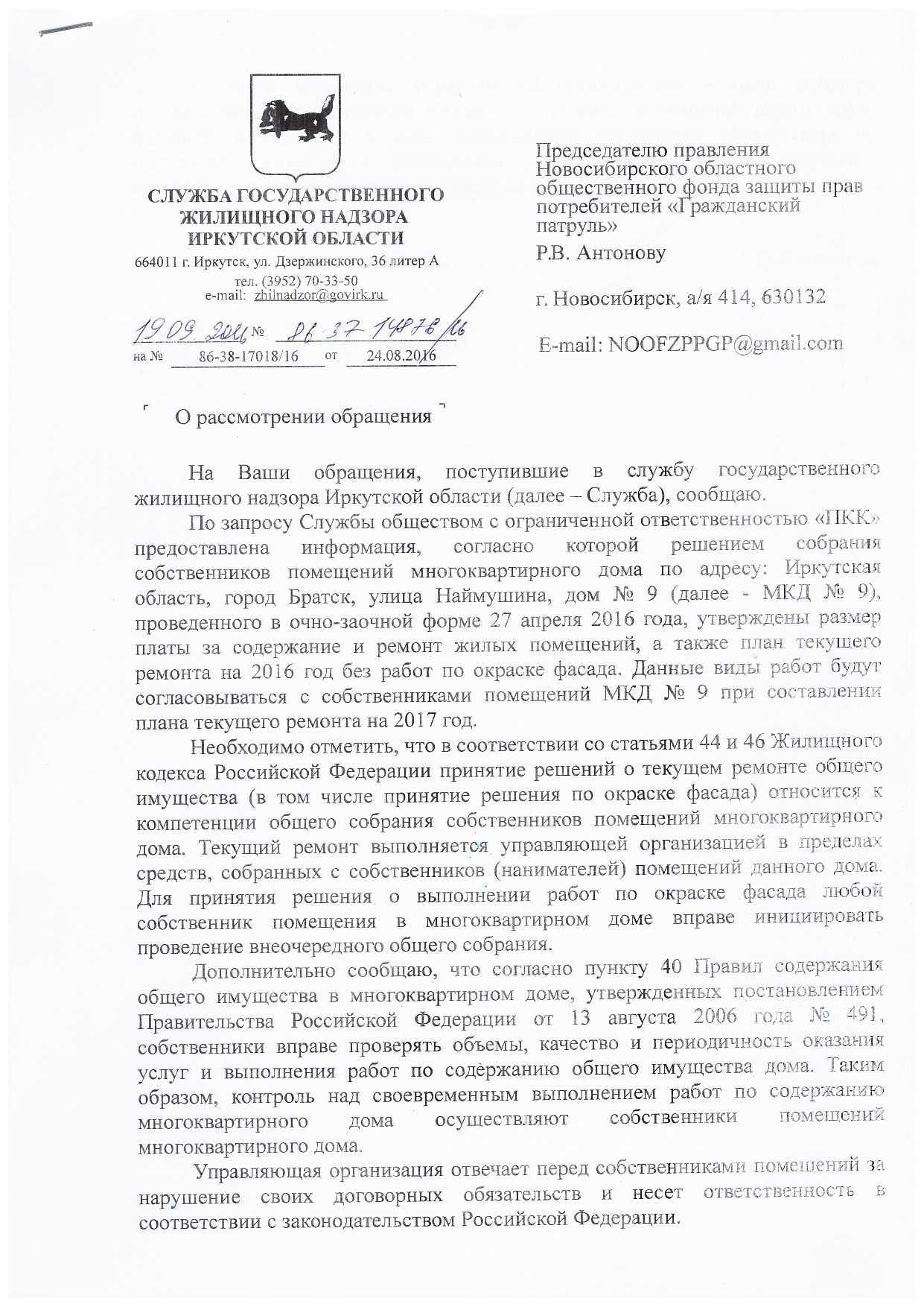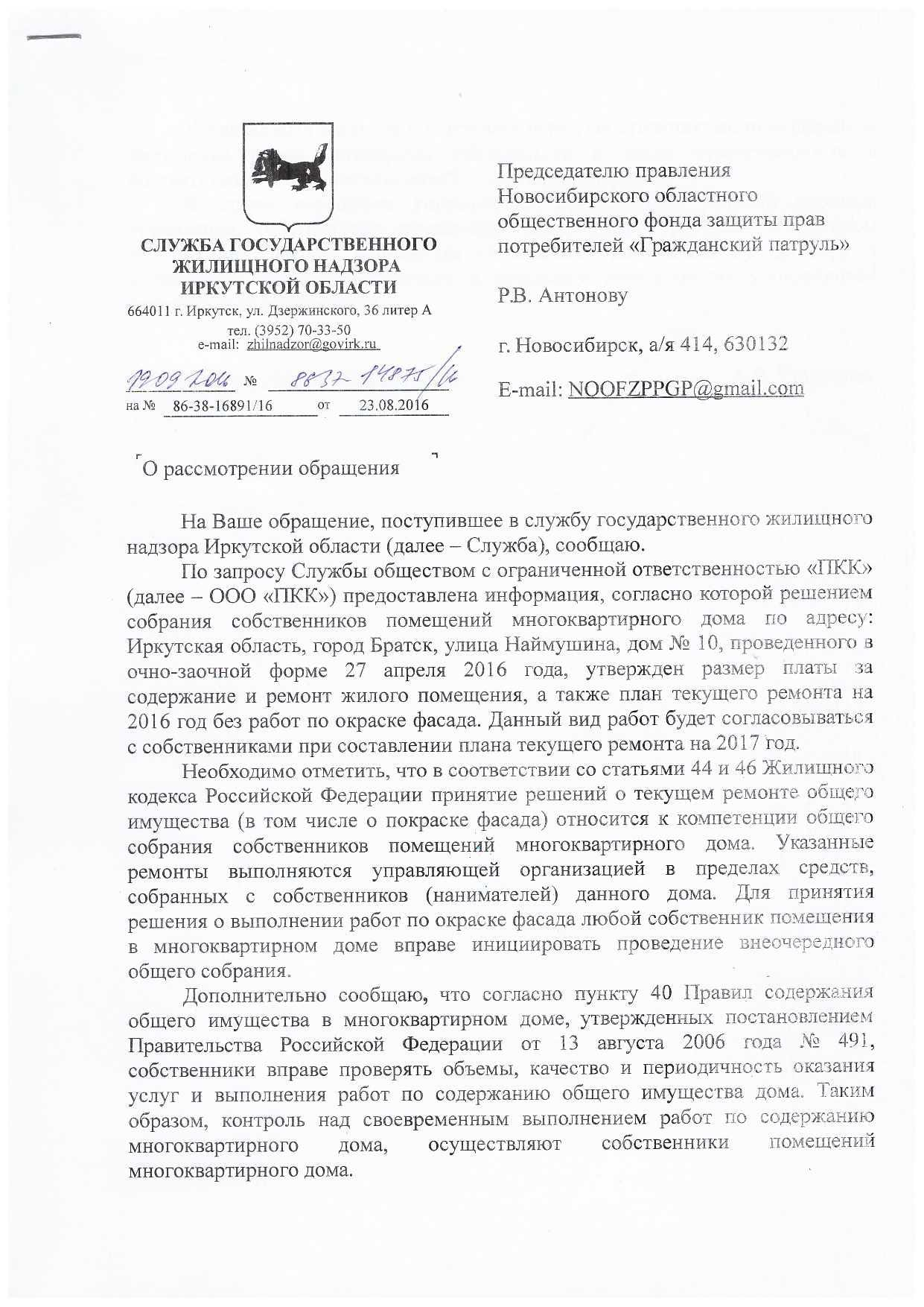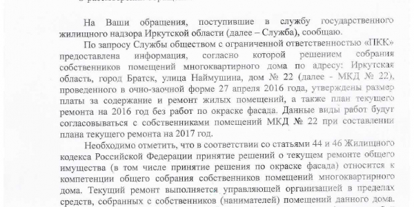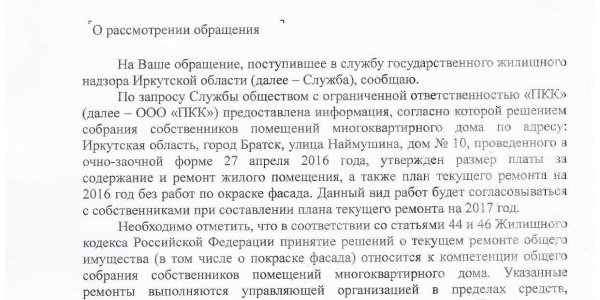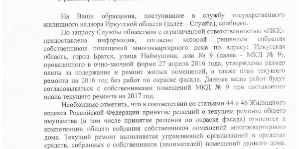 Номер жалобы:8199 Тип жалобы:Иные проблемы ЖКХ Название объекта: Регион:Иркутская область Город:Братск Адрес:улица Наймушина, 16 Описание жалобы:Надписи на доме Статус: