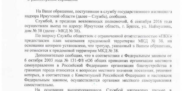 Номер жалобы:8203 Тип жалобы:Иные проблемы ЖКХ Название объекта: Регион:Иркутская область Город:Братск Адрес:улица Наймушина, 38 Описание жалобы:Вдоль внутридворовой дороги в районе третьего подъезда когда-то был тротуар, но его перестали убирать и сейчас он зарос травой и землей. Только местами торчит асфальт и бордюры. Необходима очистка. Статус: