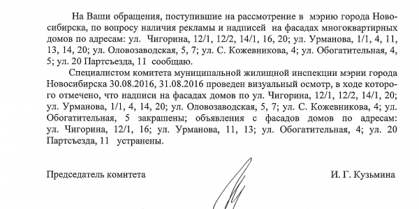 Номер жалобы:8073 Тип жалобы:Иные проблемы ЖКХ Название объекта:Управляющая Компания Город:Новосибирск Адрес:Новосибирск, улица Чигорина, 20 Описание жалобы:Надписи на доме чигорина 20 Статус: