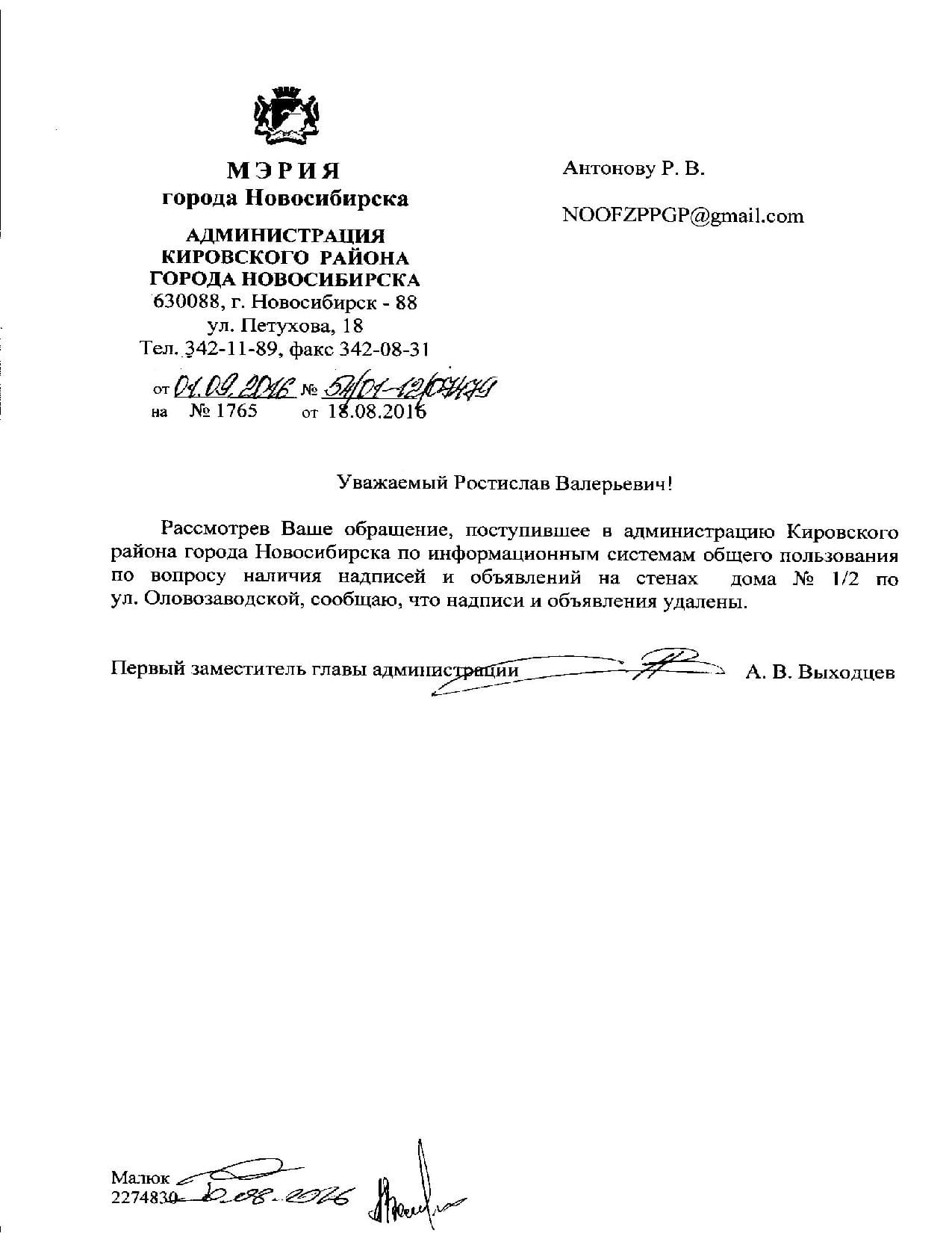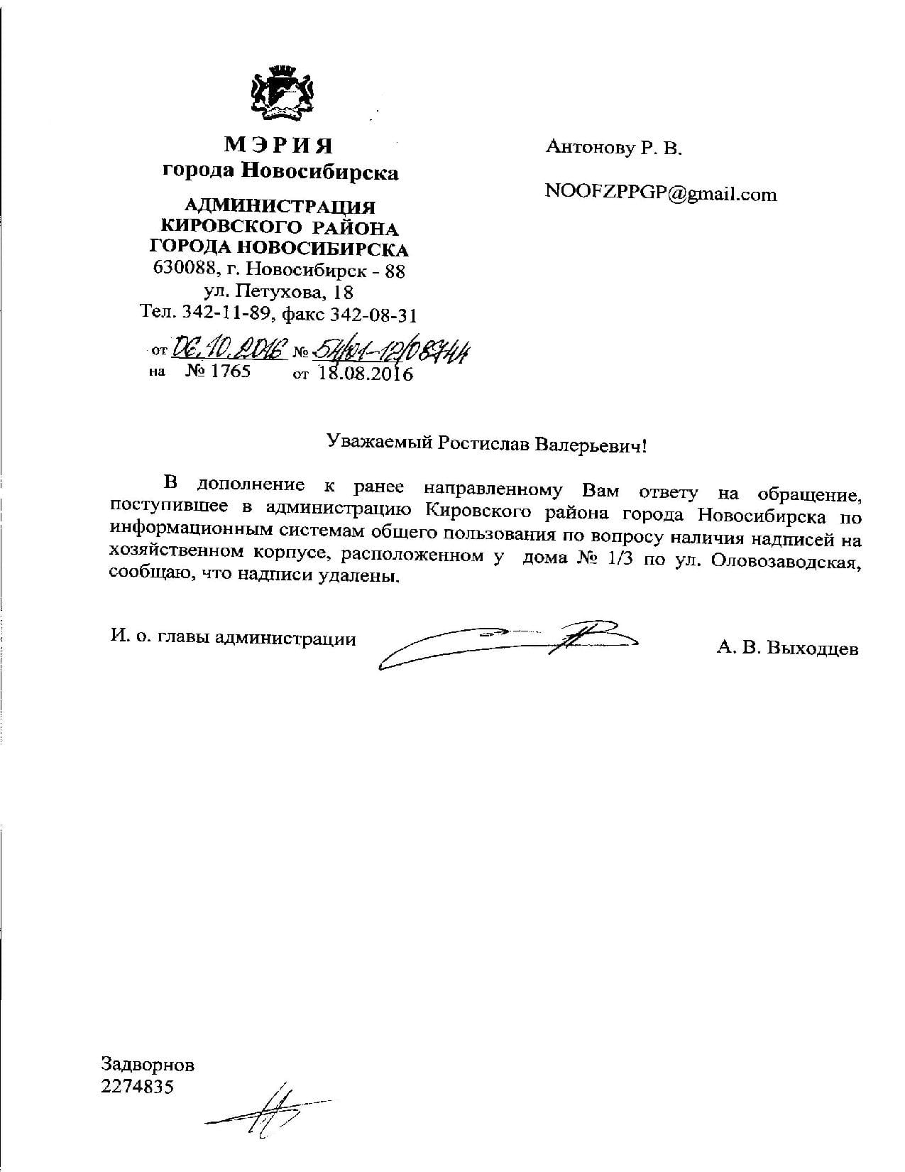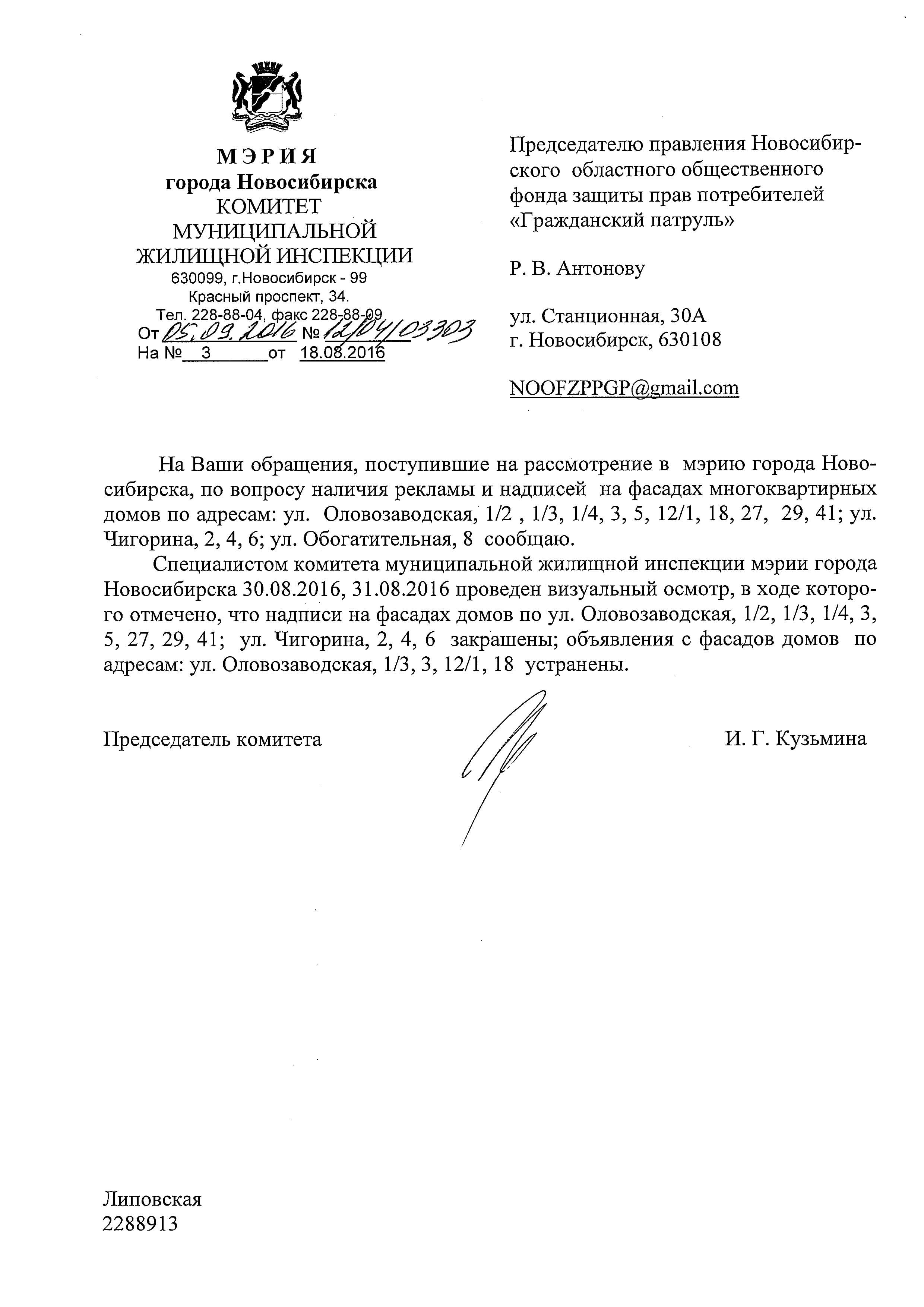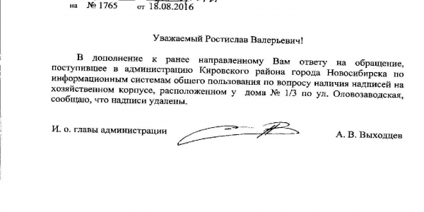 Номер жалобы:8034 Тип жалобы:Иные проблемы ЖКХ Название объекта:Управляющая Компания Город:Новосибирск Адрес:Новосибирск, Оловозаводская улица, 1/3 Описание жалобы:надписи на хоз.корпусе Статус: