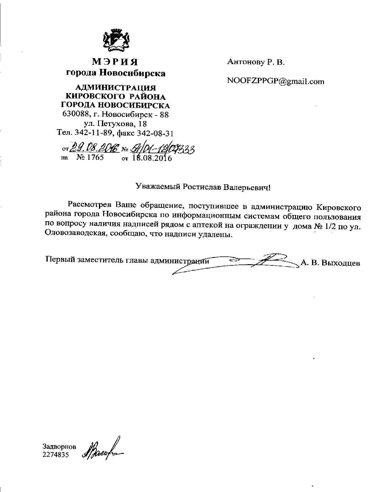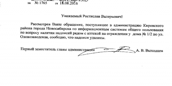 Номер жалобы:8040 Тип жалобы:Иные проблемы ЖКХ Название объекта:Управляющая Компания Город:Новосибирск Адрес:Новосибирск, Оловозаводская улица, 1/2 Описание жалобы:Надписи рядом с аптекой Статус: