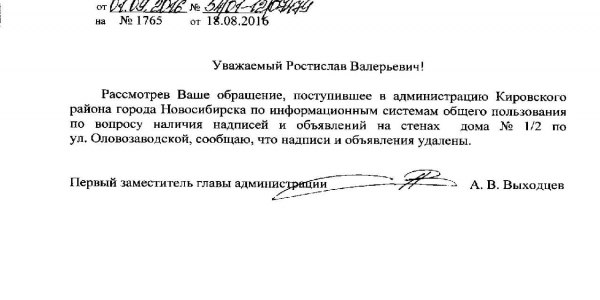 Номер жалобы:8039 Тип жалобы:Иные проблемы ЖКХ Название объекта:Управляющая Компания Город:Новосибирск Адрес:Новосибирск, Оловозаводская улица, 1/2 Описание жалобы:Надписи и объявления на хоз корпусе Статус: