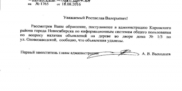 Номер жалобы:8035 Тип жалобы:Иные проблемы ЖКХ Название объекта:Управляющая Компания Город:Новосибирск Адрес:Новосибирск, Оловозаводская улица, 1/3 Описание жалобы:Объявления на дереве во дворе дома Статус: