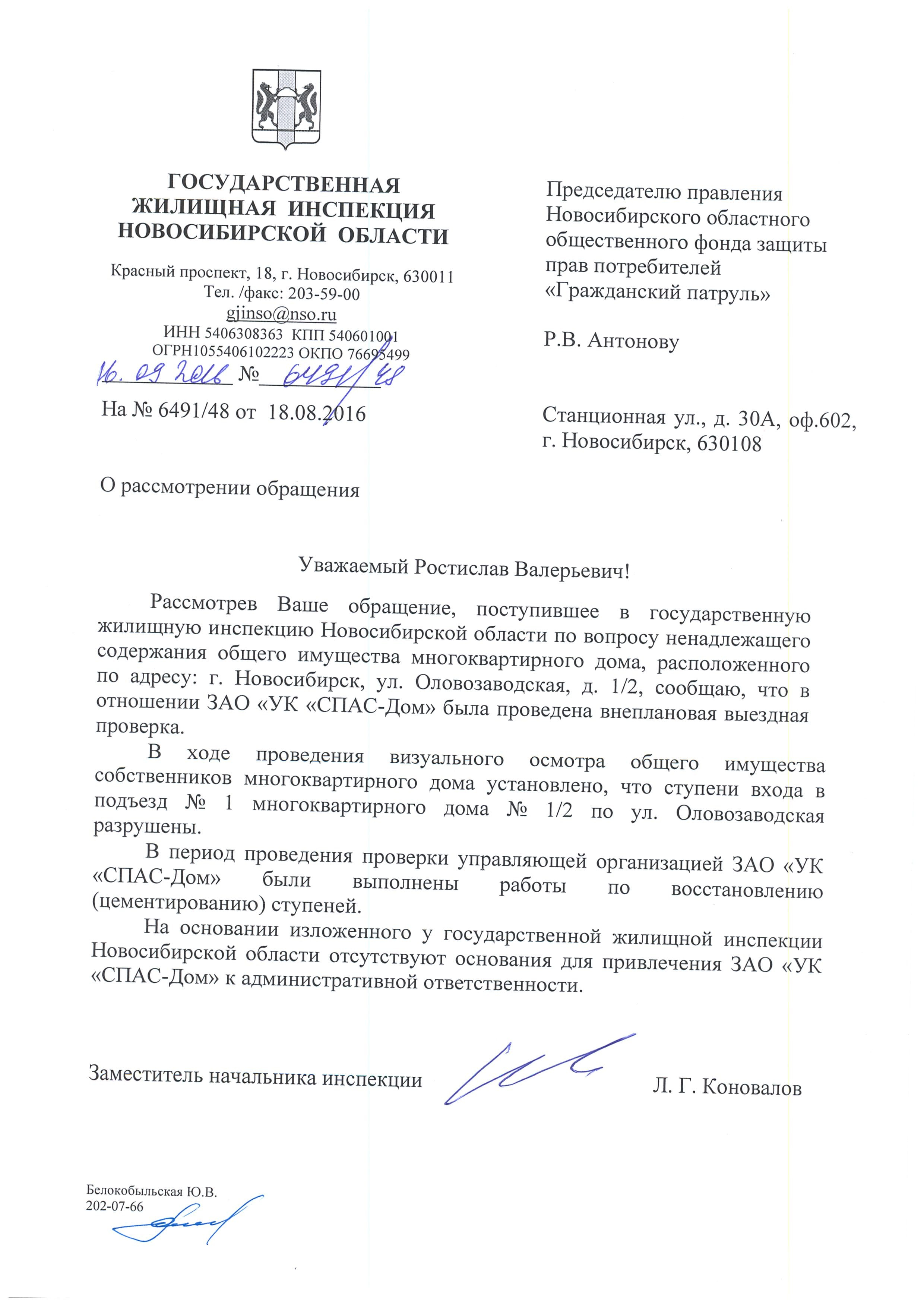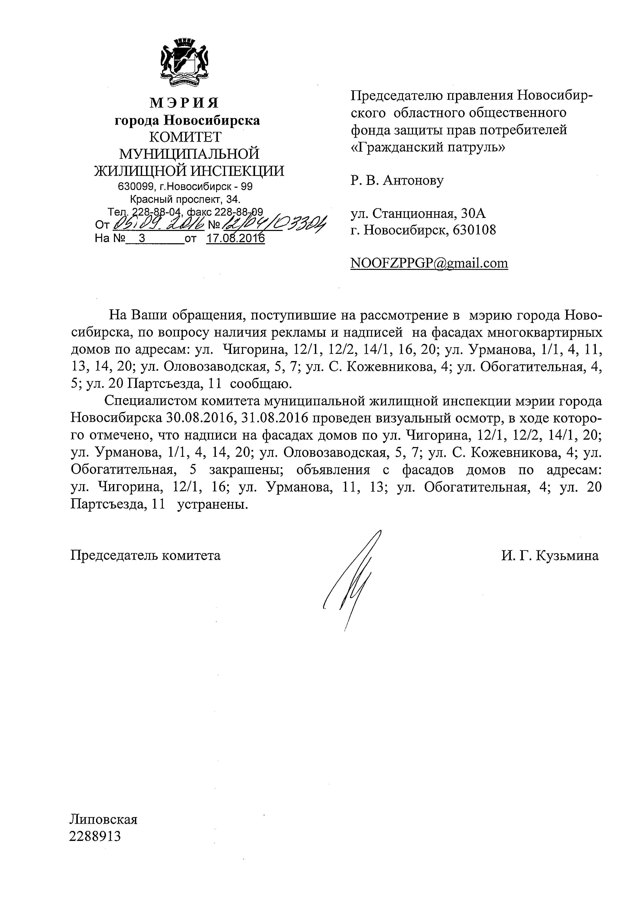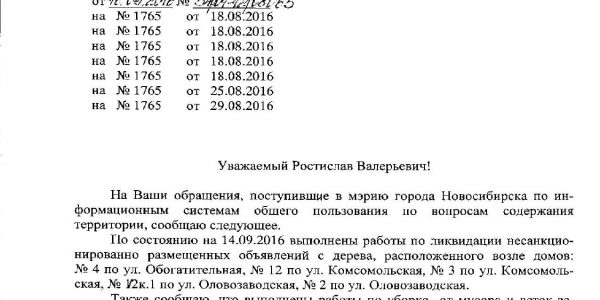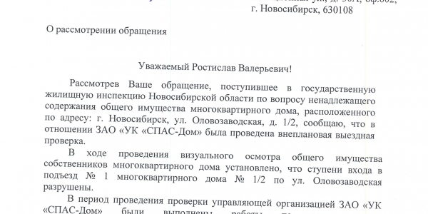Номер жалобы:8017 Тип жалобы:Иные проблемы ЖКХ Название объекта:Управляющая Компания Город:Новосибирск Адрес:Новосибирск, Оловозаводская улица, 1/2 Описание жалобы:Надписи и объявления Статус: