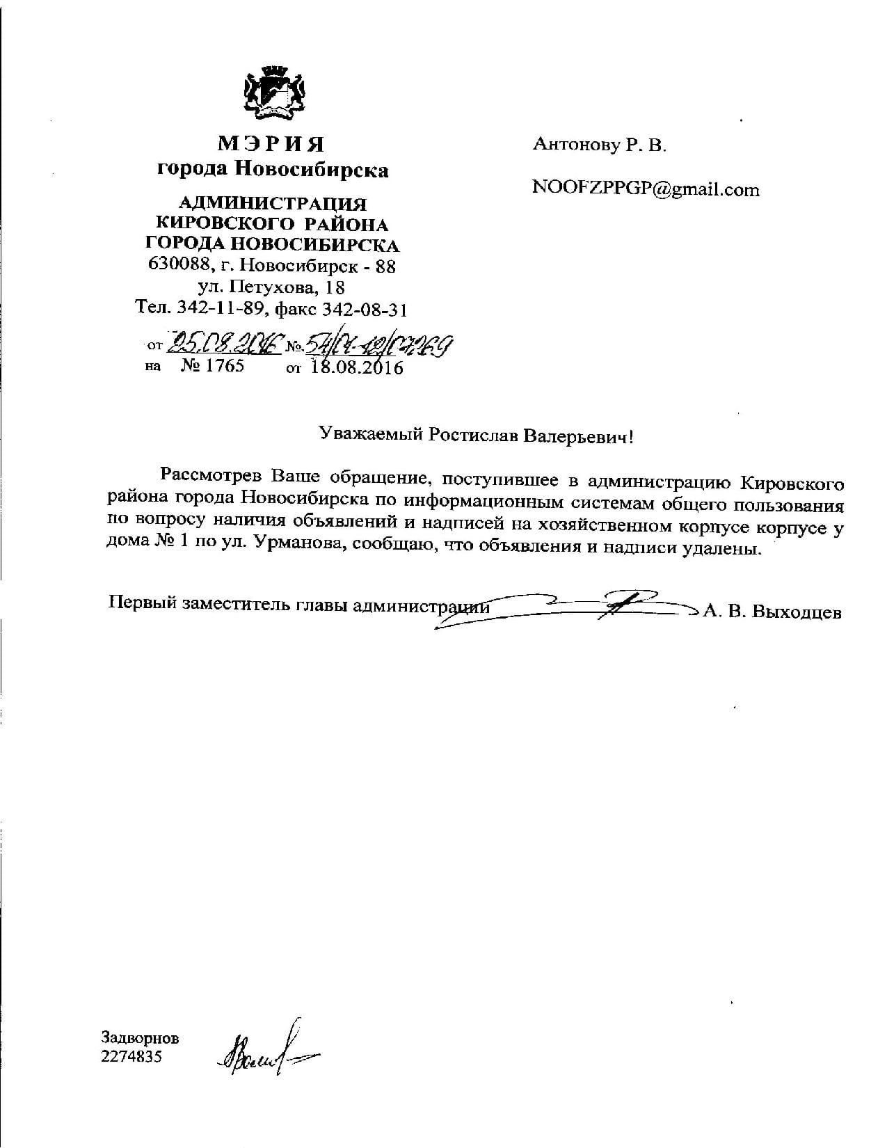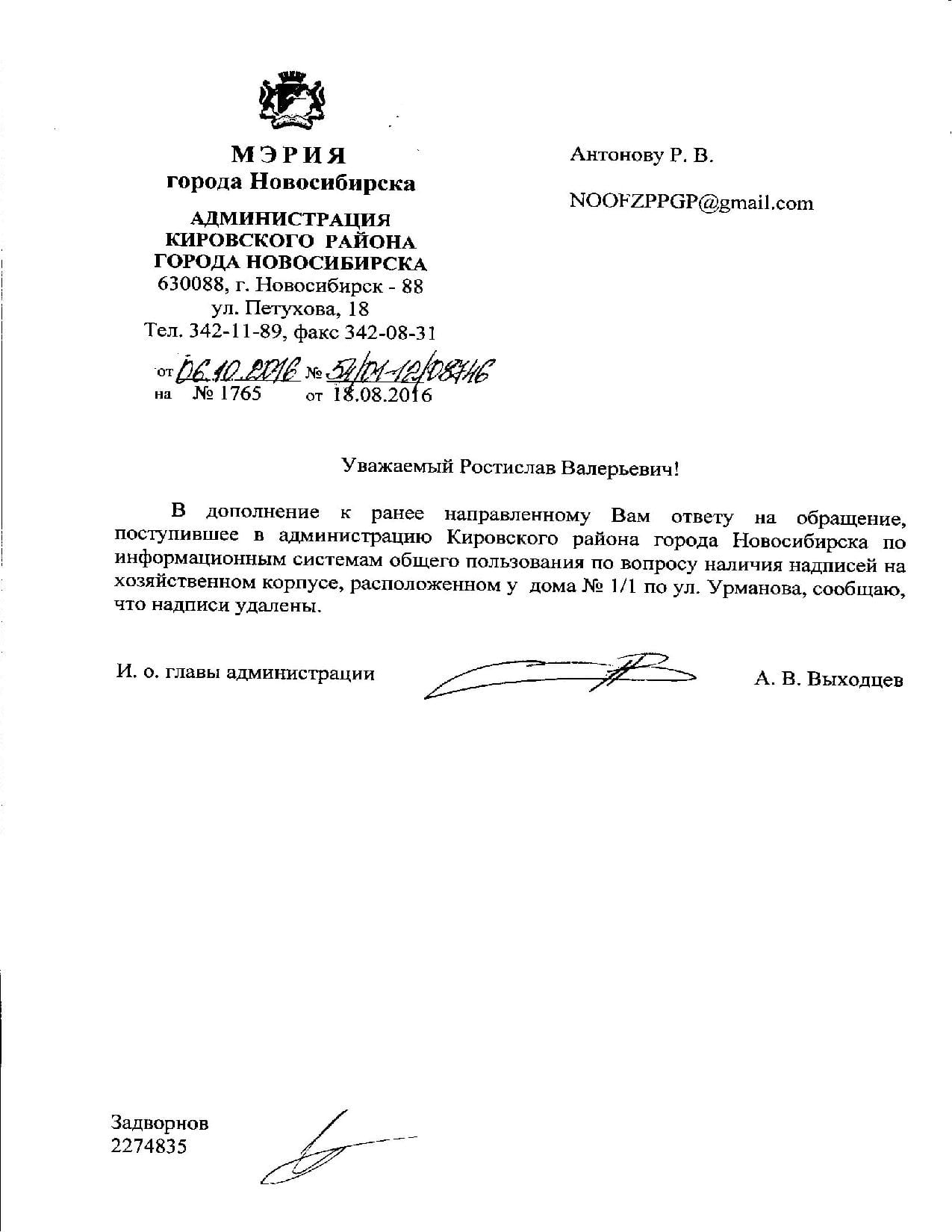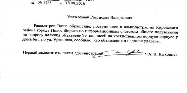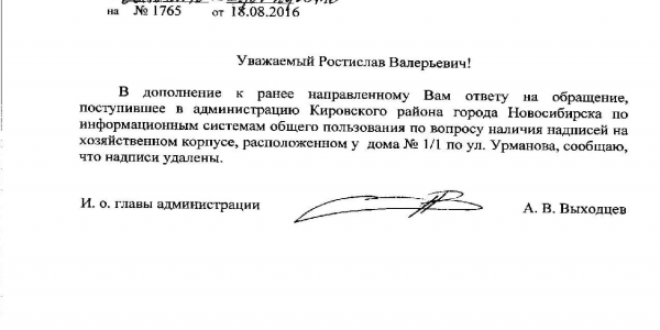 Номер жалобы:8011 Тип жалобы:Иные проблемы ЖКХ Название объекта:Управляющая Компания Город:Новосибирск Адрес:Новосибирск, улица Урманова, 1/1 Описание жалобы:Надписи на хоз корпусе во дворе дома Статус: