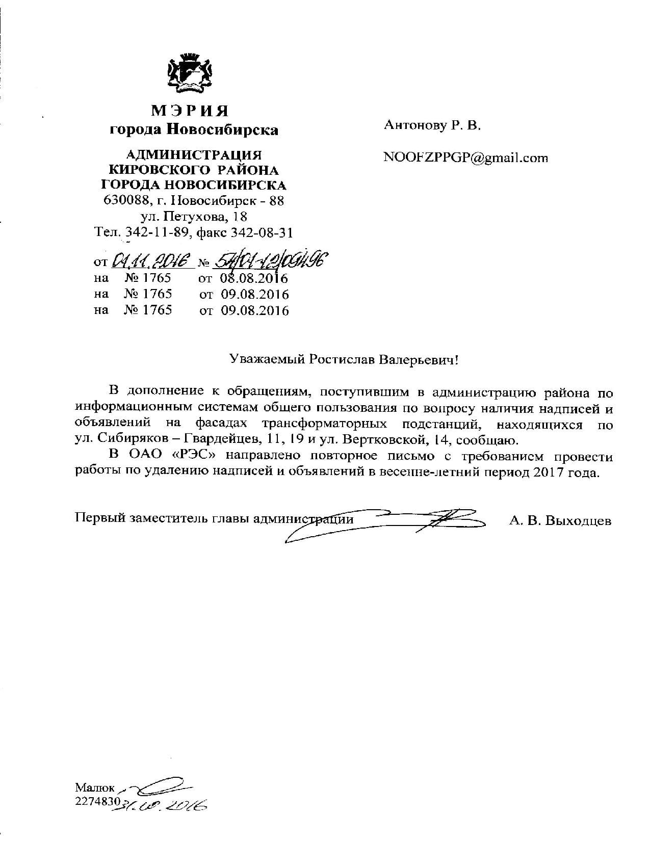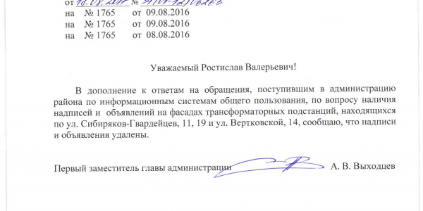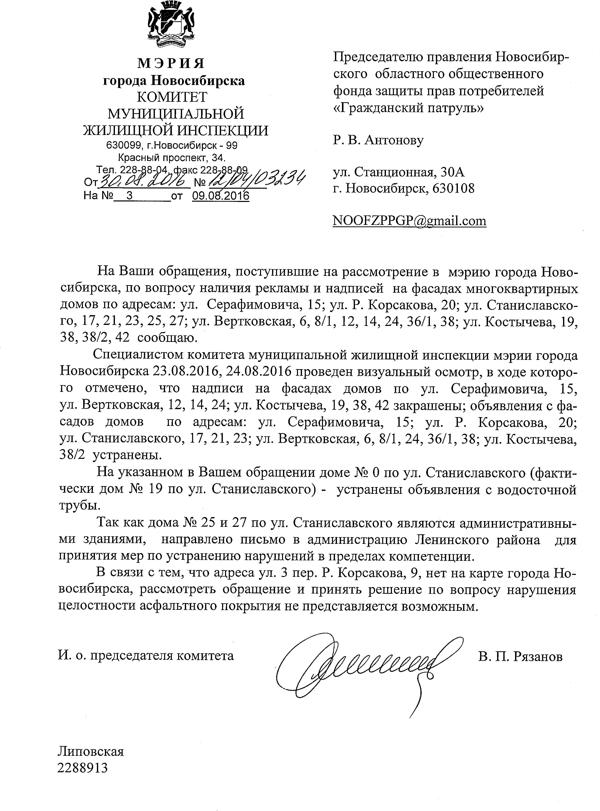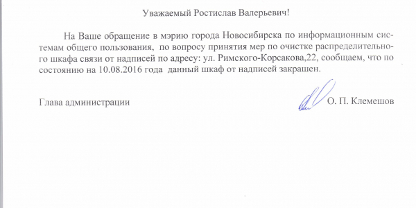 Номер жалобы:7703 Тип жалобы:Иные проблемы ЖКХ Название объекта:Управляющая Компания Город:Новосибирск Адрес:Новосибирск, улица Римского-Корсакова, 22 Описание жалобы:Надписи и объявления Статус:
