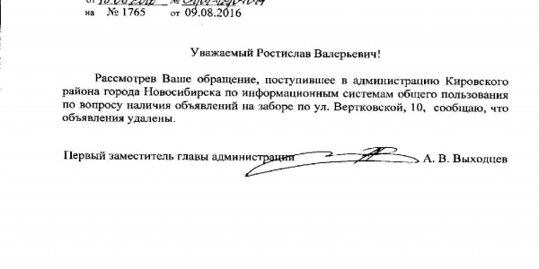 Номер жалобы:7697 Тип жалобы:Иные проблемы ЖКХ Название объекта:Управляющая Компания Город:Новосибирск Адрес:Новосибирск, улица Вертковская, 10 Описание жалобы:На заборе объявления Статус: