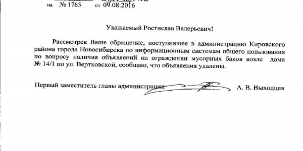 Номер жалобы:7699 Тип жалобы:Иные проблемы ЖКХ Название объекта:Управляющая Компания Город:Новосибирск Адрес:Новосибирск, улица Вертковская, 14/1 Описание жалобы:Объявления Статус: