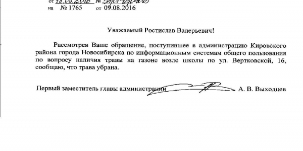 Номер жалобы:7702 Тип жалобы:Иные проблемы ЖКХ Название объекта:Управляющая Компания Город:Новосибирск Адрес:Новосибирск, улица Вертковская, 16 Описание жалобы:Кучи травы на газоне около школы Статус: