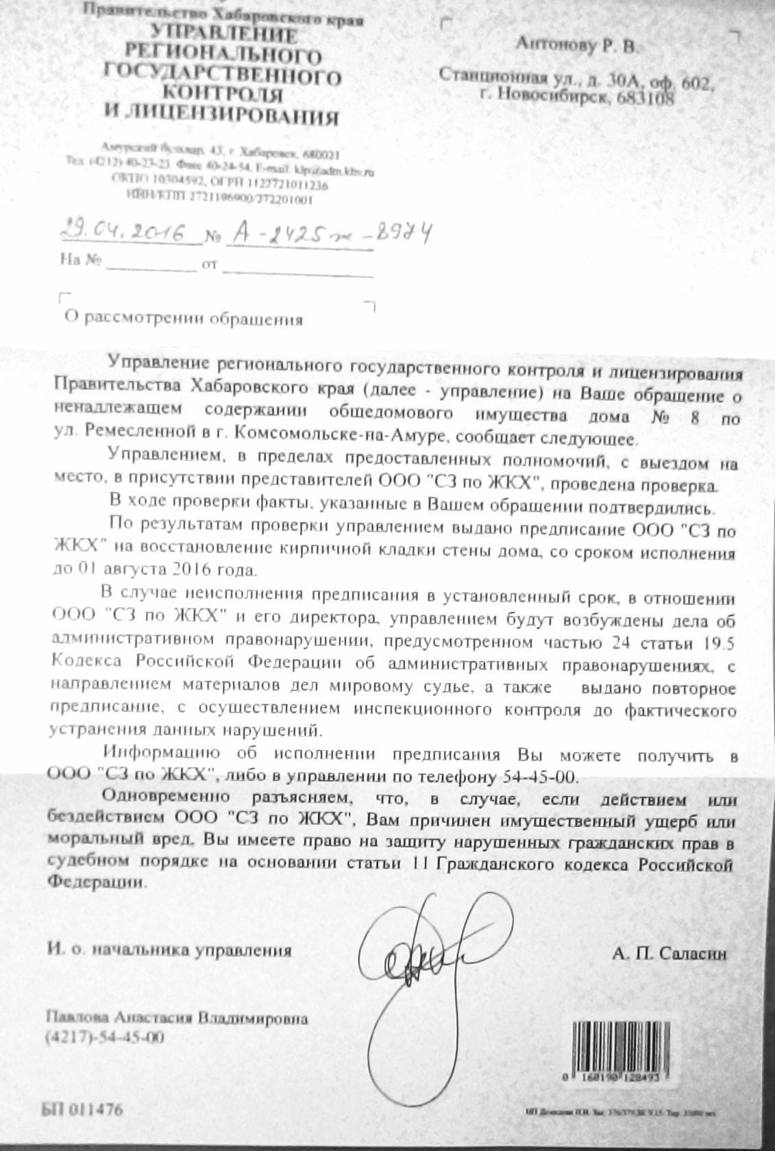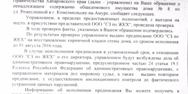 Номер жалобы:7671 Тип жалобы:Иные проблемы ЖКХ Название объекта:ук ооо сз по жкх Город:Комсомольск-на-Амуре Адрес:ремесленная 8 Описание жалобы:ремонт в подъезде так и не выполнен Статус: