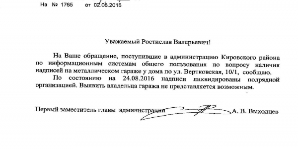 Номер жалобы:7594 Тип жалобы:Иные проблемы ЖКХ Название объекта:Управляющая Компания Город:Новосибирск Адрес:Новосибирск, улица Вертковская, 10/2 Описание жалобы:Надписи на гаражах Статус: