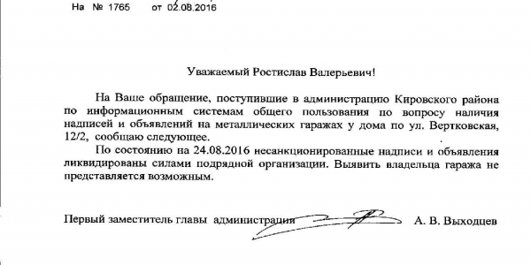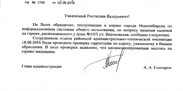 Номер жалобы:7596 Тип жалобы:Иные проблемы ЖКХ Название объекта:Управляющая Компания Город:Новосибирск Адрес:Новосибирск, улица Вертковская, 12/2 Описание жалобы:Надписи и объявления на гаражах Статус: